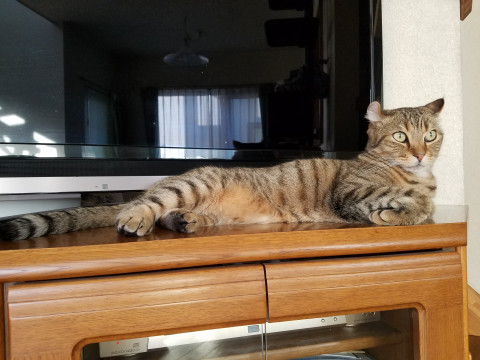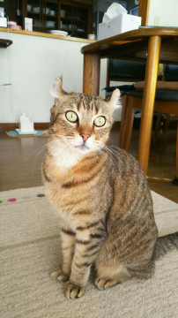 キジトラで短毛のアメリカンカールです。
