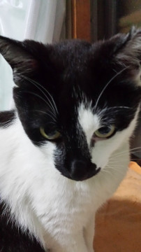 お顔の模様がハチワレなんですが変わっています。避妊済み。 尻尾がくるっと一回転してます。尻尾は短い。 短毛 雑種 首輪、鈴、電話番号付迷子札付けています。全体的にスラっとしていなくコロッとという感じです。