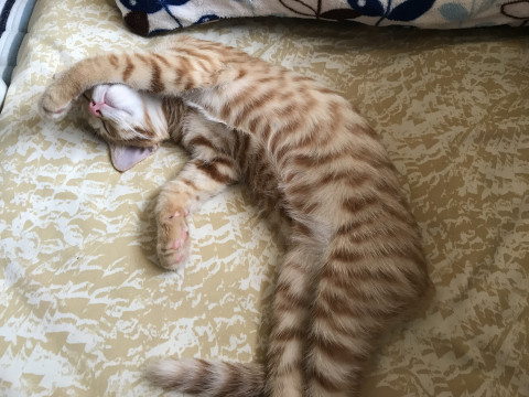 痩せ型の模様のはっきりした茶トラ まだ子猫なので怖がりで去勢もしていません。