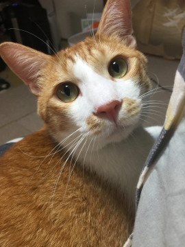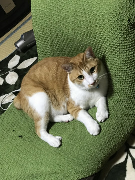 尻尾がお団子で、鳴き声がちょっとだみ声の茶白ねこです。体重が7kgあるのでけっこう大きい方だと思います。