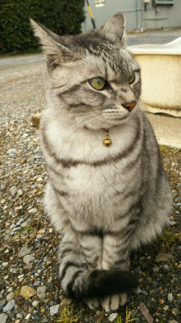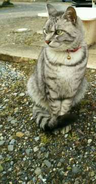 黒白のキジトラ柄 しっぽが長い 鼻右上に黒いシミあり 鳴き声は高め とても人なれしてます