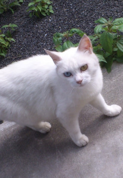 オッドアイの白猫でシッポは短め(先っぽが少し曲がってます)