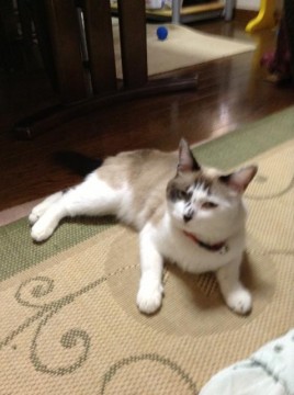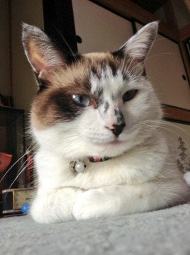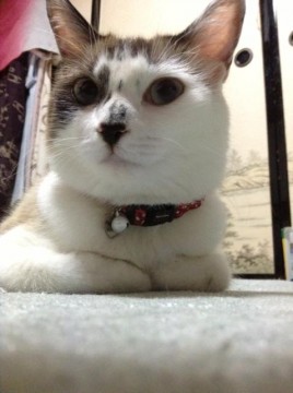 足は白いですが、背中は全体的にうすこげ茶で尻尾は黒寄りのこげ茶です。水色の目をしています。
