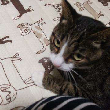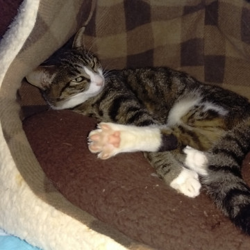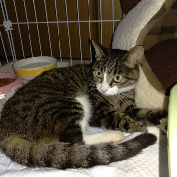 小柄でキジトラのメス・後ろ足が1本無く、両前足には足袋を履いているように白い。尻尾がとても長く耳はカットされています。