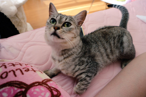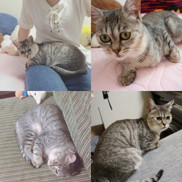 アメショの模様で、顔はぺちゃっとしたマンチカン風のかたちで、体自体小さめで、左前足が麻痺していて動かないです。警戒心が強く、飼い主でも、いきなり立ち上がったり、大声で笑ったりするとびっくりして逃げます。でも、甘えん坊なので撫でられるのが大好きです。