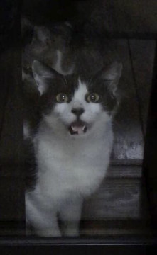 オレオは黒のハチわれでかぎ尻尾、瞳はグリーン、鼻は黒、左耳にカットあり