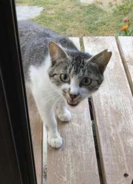 デルタはサバトラでかぎ尻尾、瞳はグリーン、鼻は黒、左耳にカットあり