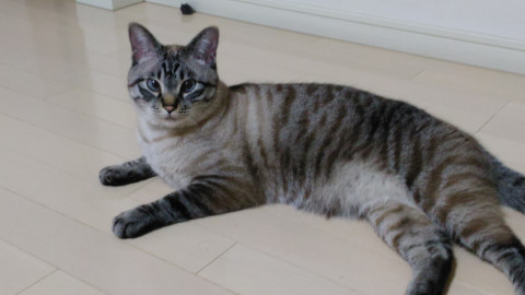 雑種で目が青く、サバトラのような柄です。体重は5~6kgほど。去勢手術済み。
