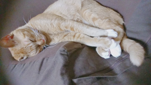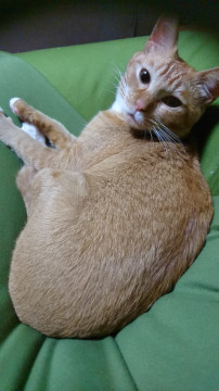 キツネ色の茶とら、手足の先の毛が靴下のように少し白いです。首の下、お腹も少し白い毛です。