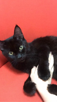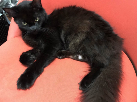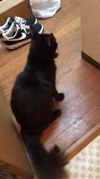 長毛種メインクーンの黒猫 薄い金色の目 長い尾 尾ふわふわ