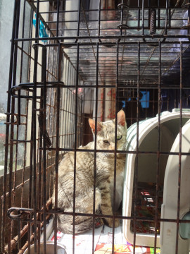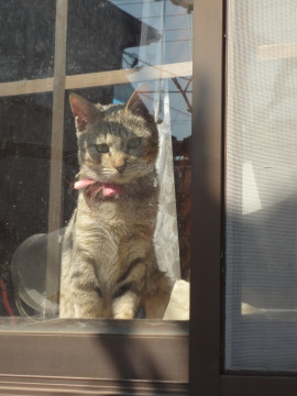 人間の手を怖がり、逃げます。細く子猫のようです。ピンクの首輪に迷子札を着けていますが、捕まえようとすると逃げます。灰色に黒縞、背中に縦に3本、黒縞があり、保護(4/8,2017)したとき右後ろ足首の皮がはがれ、骨折した、4指180度、5指90度捻れてまだ出血していました。で、動物病院で治療しましたが、その指は、捻れたままで、4指の爪は垂直に立っています。避妊手術、ワクチン済。