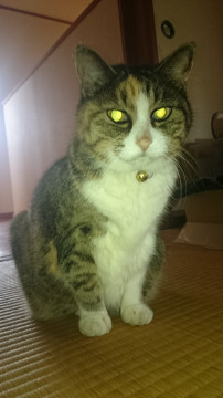 ピンクの首輪に金の鈴のついた三毛猫です。