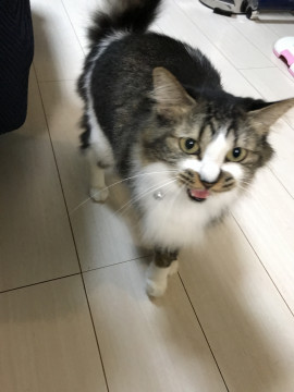 鳴き声は高く、呼ぶとニャーと返事をします。