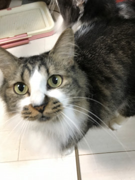 キジシロで口の周囲と胸、足先が白く、長毛です。メインクーンに似ています。