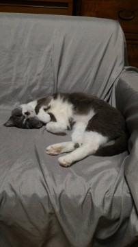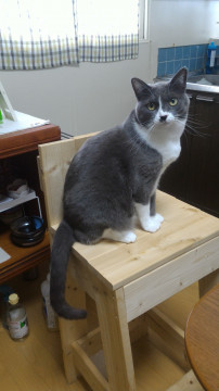 毛の色が茶色がかった灰色です。ハチワレで白い部分は真っ白です。鼻の右下に斑点があります。左耳に避妊手術済みしるしのカットがしてありサクラ耳です。尻尾はまっすぐで長いです。