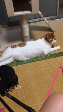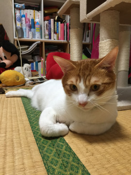 6キロ近くある雄猫です。黄色で鈴のついた首輪をしています。全体的に白で頭と尻尾と模様が茶色です。尻尾はかぎしっぽで短いです。