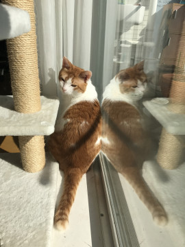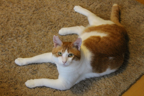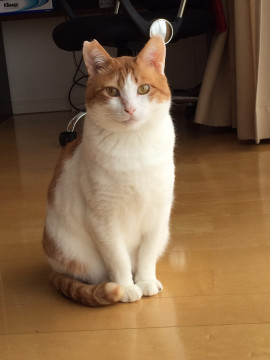 体重は6キロ弱。毛は短めで、お腹側が白、背中側が薄い茶色です。背中の茶色の部分に白い点があります。