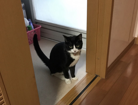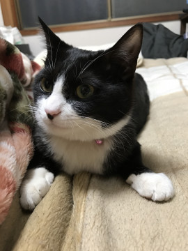 白黒のハチワレの女の子で、鼻はピンクで鼻先だけ黒いです。尻尾は黒くてまっすぐで長いです。ピンクのノミ取り首輪をしていて大きめの鈴が付いています。体重は3〜4キロぐらいです。生まれつき心臓に疾患があるようで、疲れやすいです。