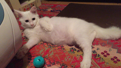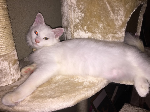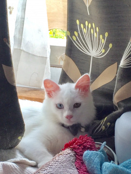 白猫、毛の長さは中毛、水色黄色のオッドアイです。
