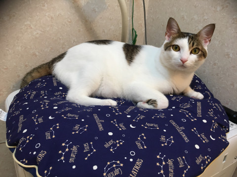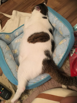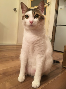 白猫の黒もようがはいった、少しぽっちゃりな猫です。しっぽはキジトラのようなシマシマです。