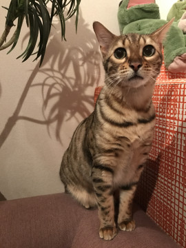 茶色の毛に黒のシマシマ模様、お腹は白くて茶色い斑点模様です。