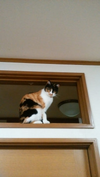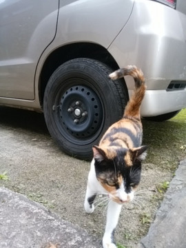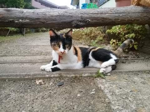 黒の部分が多い三毛猫です。