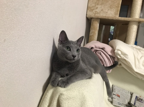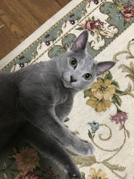オスのロシアンブルーです。ハロと呼び掛けると反応します。完全な家猫です。去勢済み。