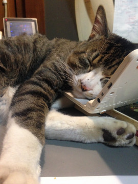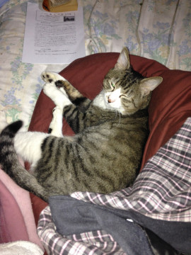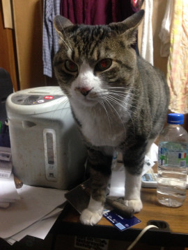 去年(2016年)12月にひょっこり入ってきたノラで、家族では私にしかなついないという警戒心があります。動物医院で検査と予防注射と虚勢手術を行っています。同医院によると推定年齢8~10才。ウチにくる以前にも飼われていたと推測されます。