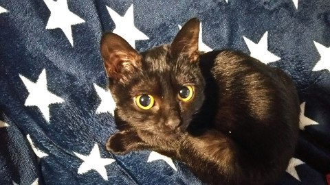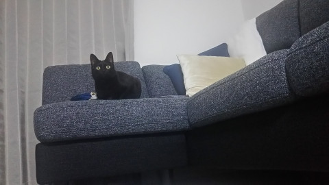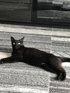 全身真っ黒ですが、お腹の毛が一部分白いです。そして尻尾の先が折れ曲がっていて鍵尻尾です。