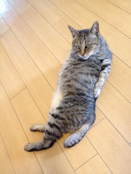 キジトラ、尻尾は半分くらいで先が少し曲がっています。