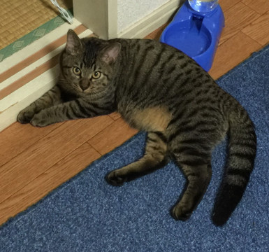 キジトラ、茶がかったグレイ、黒い縞模様、大柄、びびり、オス、2歳、赤いハートマークの入った合皮の首輪、長いしっぽ、お腹が茶色い、可愛らしい鳴き声、