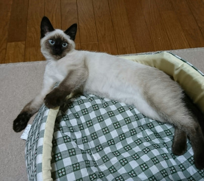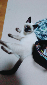 シャム猫でしっぽは長く真っ直ぐです。元は野良猫なので 飼い主以外は人なれしていません。多分、外では逃げたり隠れたりします。首輪は嫌がるのでしていません。去勢も まだ半年経っていないと思うのでしていません。