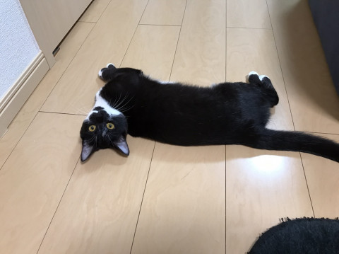全体が黒色で、顎・お腹・手先が白色の猫です。