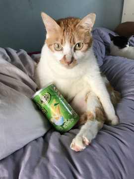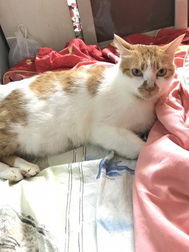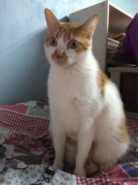 完全室内飼いで、去勢済みのオス猫、毛は茶色と白色のミックスで、口の周りが一輪の茶色毛をしてて、マックスをかぶるみたいです。ジャージー牛に似てるって主人がよく言われてた。