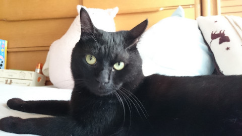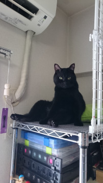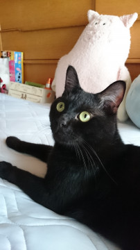 全身真っ黒で、黄色の瞳(光の加減で緑にも見えます)、短毛で、しっぽが長いです。