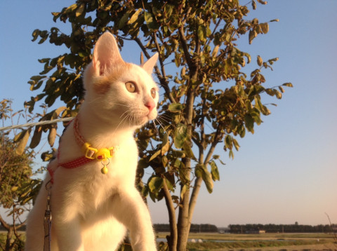 白猫で尻尾は茶と白の縞模様。頭に茶が入り、茶の鈴の付いた首輪に、青いハーネスを付けています。しろっぺと呼ぶと尻尾をたてて返事をしますが、抱っこは嫌いで、初めての人には憶病です。