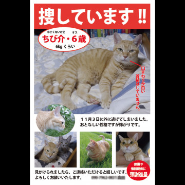 本日22日目に戻ってきました。近所の方々の協力と毎日の捜索で声を聞いてくれていたと思います。近所の方の情報でかなり地域を絞って捜していたのが良かったようです。また、この掲示板には力づけられました。ありがとうございました。