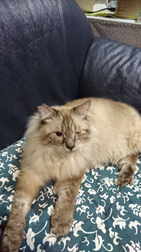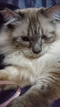 白色しっぽ茶色顔の真ん中縦じま黒色。左目半開き。長毛モサモサ。