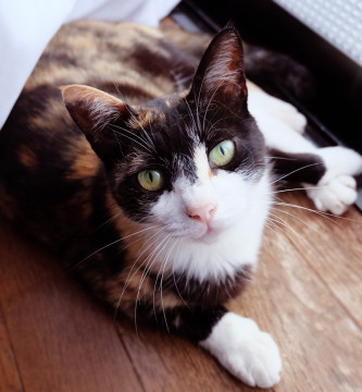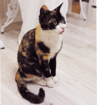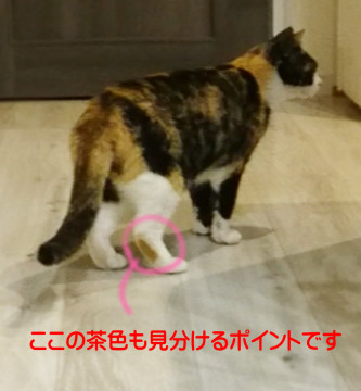 外側は黒っぽい三毛猫で、お腹や足の先は真っ白です。