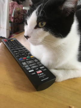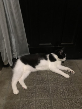 黒と白のはちわれで、鼻の下に黒いほくろがあります。
