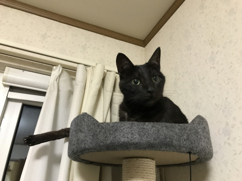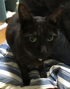 去勢済み黒猫の男の子で、背中から尻尾にかけて茶色が混じりしま模様も入っています。痩せ型、尻尾が長く、まだ子猫のような鳴き方をします。首輪なしです。