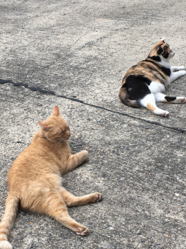 背中の茶色は茶トラ模様。人は警戒して逃げます。去年夏に我が家の茶トラネコに誘われてうちに来て、ご飯食べて、泊まってました。