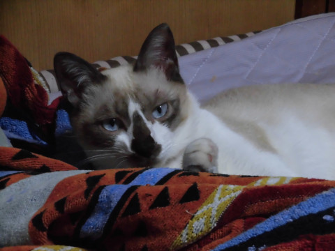 鼻はこげ茶色、瞳がブルーです。足・手・腹側は白です。