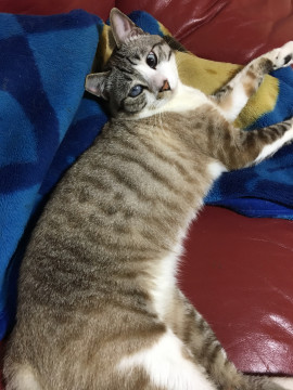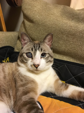 片目が白くなっていて見えない状態です。体の色はしましまでグレーと茶色を混ぜたような色です。オスですが、体が少し小さめで、手足も細いです。