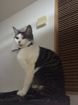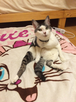 雑種ですが、キジトラに近いです。灰色と黒のシマシマで、魚のサバみたいな柄。お腹は白で、背中にハート形の白い模様があります。