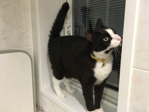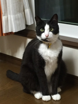 黒のハチワレ、アゴに黒模様、右耳カット、お腹と手足が白い、黄色い首輪(鈴付き)