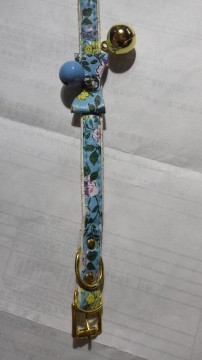 首輪 : 水色の合皮で花柄あり。金色の鈴が付いています。