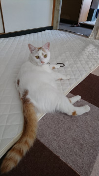 白猫で両耳が茶色、鼻がピンクです。首輪が茶色で大きい鈴が1個ついてます。
