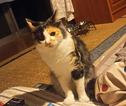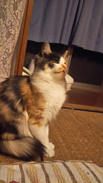 ▪やや長毛タイプの三毛猫の女の子▪しっぽふさふさ▪目の色:濃い黄土色▪ピンクの鼻▪ピンクと黒が混じった肉球▪左目の涙出るところの近くに小さな黒いホクロ▪人見知りで警戒心強い。だっこ等困難▪走るの速く、ジャンプ力もある▪食欲はあるがガツガツは食べない、警戒してるとなかなか食べない。▪避妊手術を来週に控えていた為、まだ手術してません。▪首輪無し
