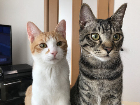 白地に茶トラの猫です。鼻の少し上に茶色の模様があります。
